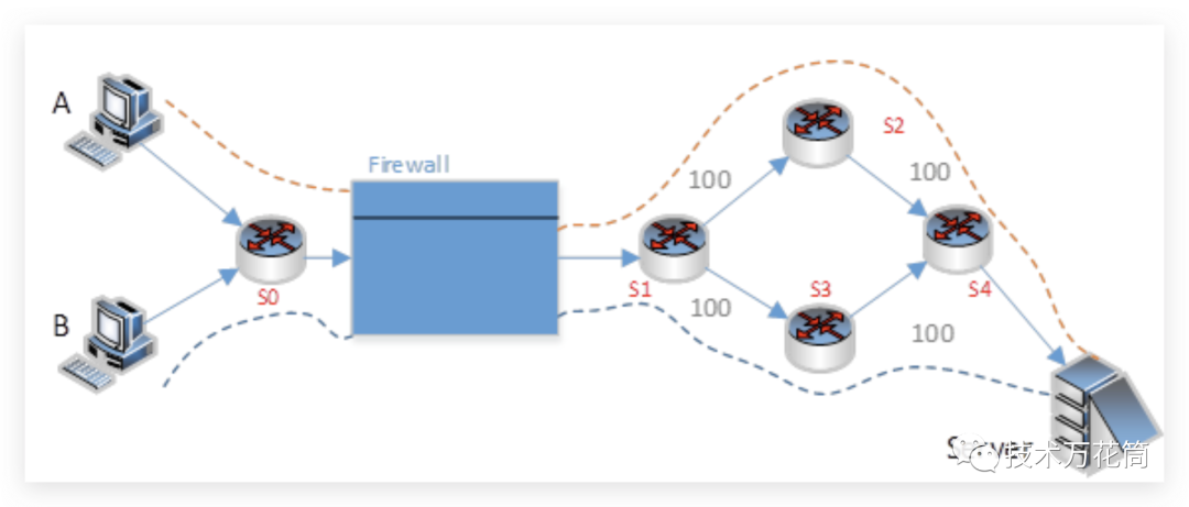 ECMP是一种等价路由协议,在IP数据包寻址转发过程中,如果从A到B有多条转发路径,那么通常路由器会选择代价较小的那一条,除非这条链路出现拥塞才会选择其他的路径,而ECMP协议就可以同时使用所有链路,基于流的负载均衡去转发,如: