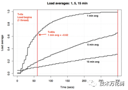 实验显示这个所谓的一分钟负载均值,在一分钟时只达到0.62。更多关于这个表达式和类似的试验,请参考Neil Gunther博士的文章How It Works和Linux源码的大量注释