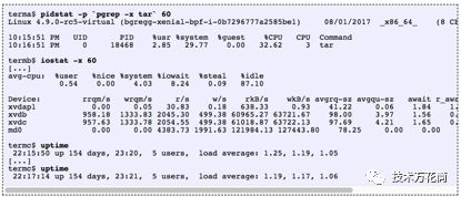 Linux的平均负载值能被全部的分解到不同的组件上去吗?这里有个案例:在一个空闲的具有8个CPU的系统上,我运行了tar命令去压缩一些未缓存的文件。它花费了几分钟,大部分都被阻塞在读磁盘上面。下面是从三个不同的终端窗口上收集到的状态: