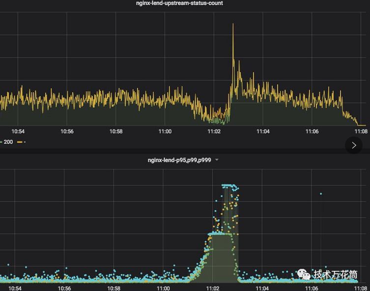 访问飙升为平时的十几倍,而5xx的状态码也是瞬间增加了十几倍(这也是报警中状态码502的来源),nginx的这个图下面的部分就是超时请求的一个表现,和负载有个很明显的关联,结合网络流量等,都可以印证(图省略掉了),就是qps的飙升导致某个服务的吞吐量跟不上。