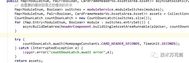 在11:01:48.770这个时刻,线程http-nio-8080-exec-1001执行,这个是tomcat处理http的socket请求的线程,也是一个线程池,这个采用的是默认的200个(坦白讲有点小,请求尖峰的时候明显不够,造成一些请求积压),下一步执行居然切换到了另外一个叫threadPoolTaskExecutor-8的异步线程执行,这个线程隔了1分钟才启动并执行,觉得挺奇怪的,看了下代码,原来这个info接口是查看用户我的财富页,显示用户所有金融产品的持仓信息,,需要去不同的底层系统获取数据,为了提高性能采用一个线程池并行去取,用一个Latch去收集数据返回: