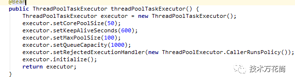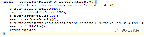 代码貌似没什么问题,但是从threadPool提交线程,到线程调度执行居然等了1分钟之多,因为线程迟迟不执行,因为nginx那边迟迟获取不到response,超过了nginx的超时时间然后就直接超时报错了。问题应该是发生在这。那线程为什么迟迟不执行呢?看了下线程池的配置: