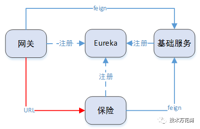 2、 此次拆分出来两个服务,一个是基础服务,一个是保险服务,但是保险服务会调用基础服务的一些用户信息、账户数据等。因为最终我们的目标是用eureka做服务注册和发现,也是为了蹚一蹚eureka的水,所以将基础服务和保险服务注册到eureka上,二者通过eureka来做服务发现和调用(feign client的方式)。而网关会尝试下发给下游系统一些基础的用户数据,所以网关和基础服务之间也是通过eureka的方式来做服务发现(feign client)
