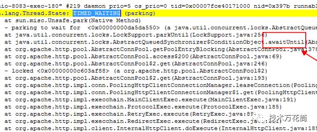 除了jvm的一些守护线程外,总共有217个线程处于以上的状态,WAITING状态,而且根据堆栈来看,都是http请求且路由的线程被阻塞了(wait),看了下堆栈,有这么一行:
