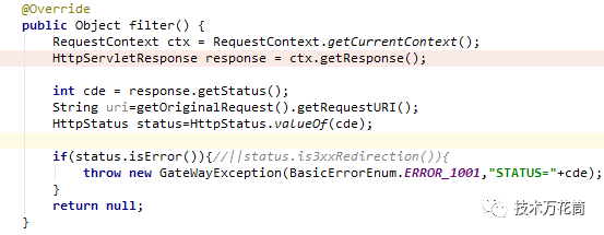 而我们自定义了一个PostErrorHandlerFilter,这个类对所有的路由结果进行检查,如果非2xx状态,则抛出异常: