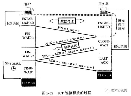 3、就是高层应用,高层应用(如http client)告诉协议层我的屁股擦完了,可以关闭了,这个时候协议层也就是TCP会再发一个ACK和FIN等回复给A,A进入FIN-WAIT-2状态,再回复给B一个ACK后,自身进入TIME WAIT(这个状态很常见,出现这个了,说明这个连接已经快释放了),B收到后直接CLOSE掉,资源释放掉。