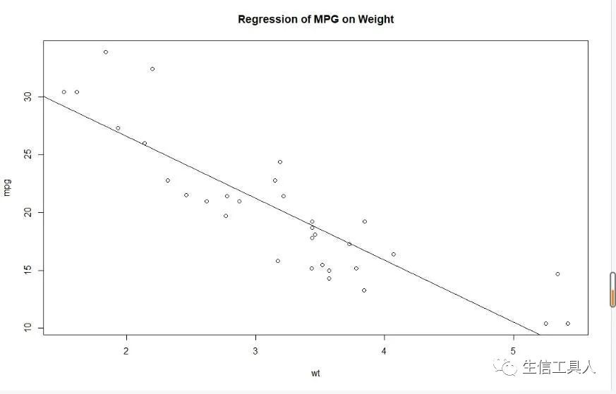 abline(lm(mpg~wt)) #添加一条最优拟合曲线
