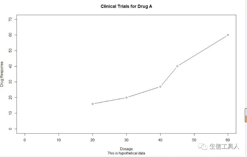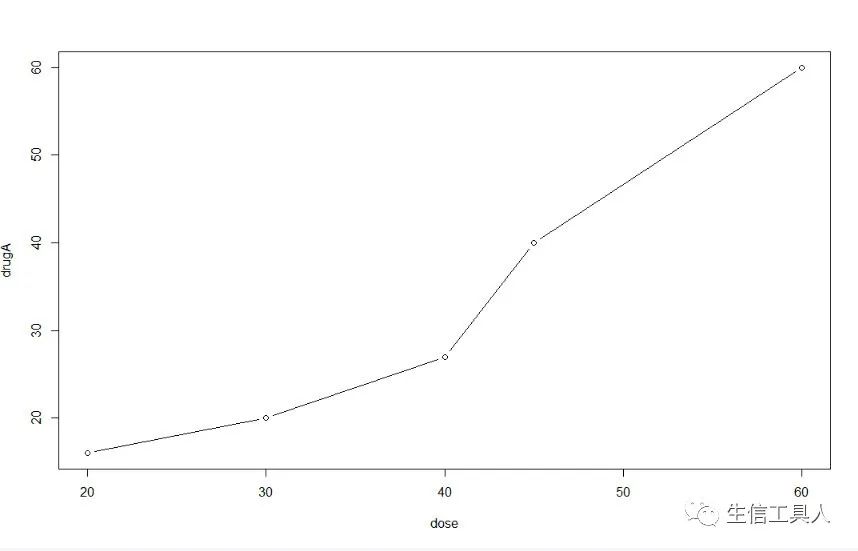 plot(dose, drugA, type="b") #创建一幅描述药物A的剂量和响应关系的图形