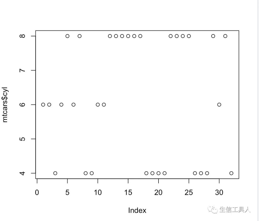 为什么都是向量却要有这么多名称呢?R 主要是一门统计画图的语言,它们意义不同,产生的图片也不同。plot(mtcars$cyl)