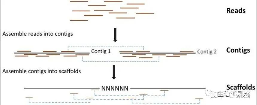 二代基因组测序的原始结果为reads,reads可以拼接为序列contig,contig进一步可以组装成更长的序列scaffold。
