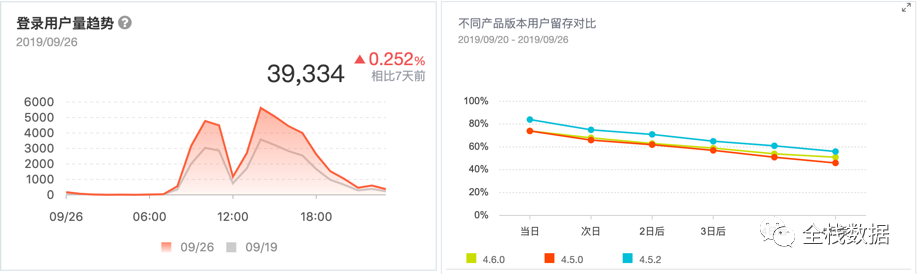 如下图登录用户量的对比就属于绝对数对比,用户留存率的对比则属于相对数对比。