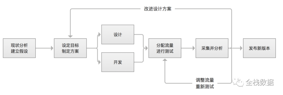 A/Btest,是将Web或App界面或流程的两个或多个版本,在同一时间维度,分别让类似访客群组来访问,收集各群组的用户体验数据和业务数据,最后分析评估出最好版本正式采用。A/Btest的流程如下: