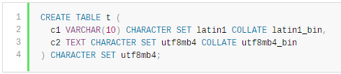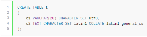 此表创建了一个名为c1的列,该列的字符集为utf8,使用该字符集的默认排序规则;创建一个名为c2的列,该列的字符集为latin1,并且使用区分大小写的(_cs)排序规则。