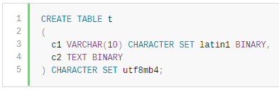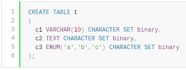 为字符字符串数据类型指定CHARACTER SET binary属性会导致将列创建为相应的二进制字符串数据类型:CHAR变为BINARY,VARCHAR变为VARBINARY,TEXT变为BLOB。对于ENUM和SET数据类型,不会发生这种情况;它们是按声明创建的。