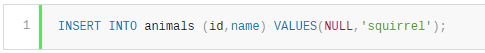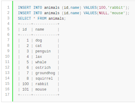 在自增列中插入任何其他值时,该列将设置为该值并重置序列,以便下一个自动生成的值从最大列值开始按顺序排列。例如:
