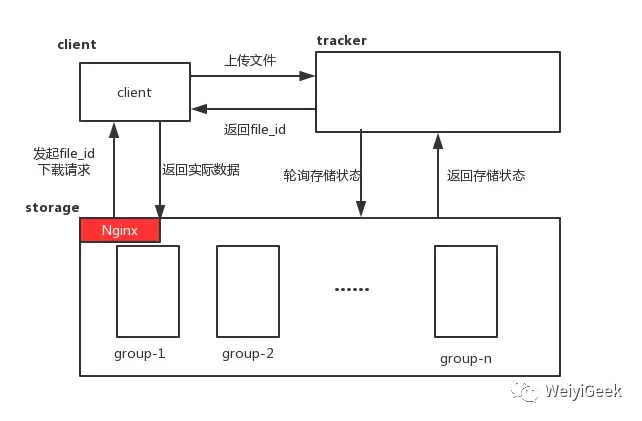 组成。其中 Storage 负责存储文件,Tracker 负责存储文件所在地址,主要作用是负载均衡和资源调度。