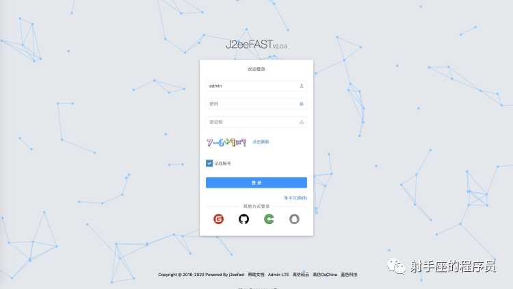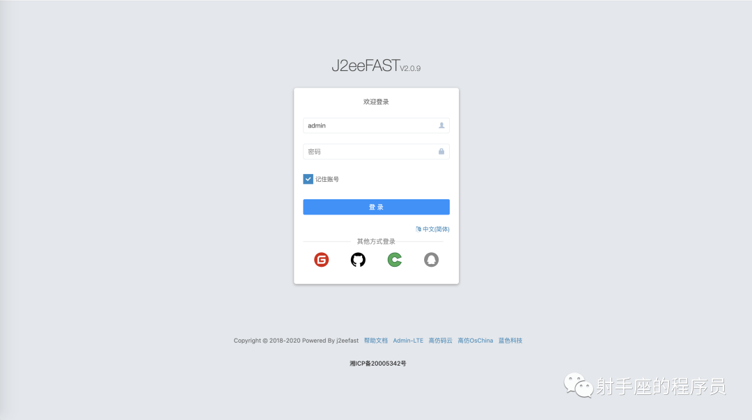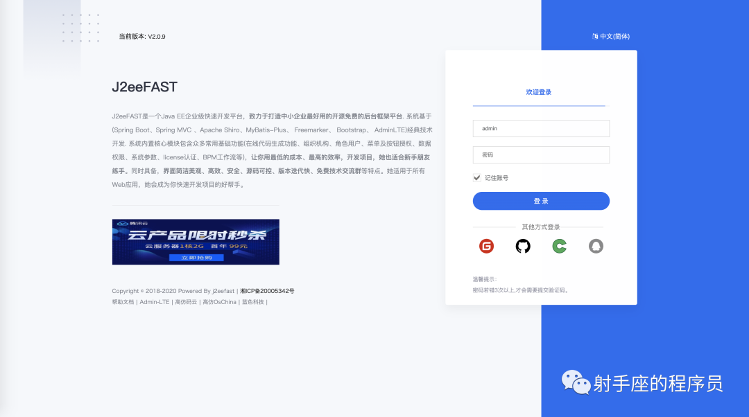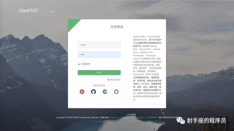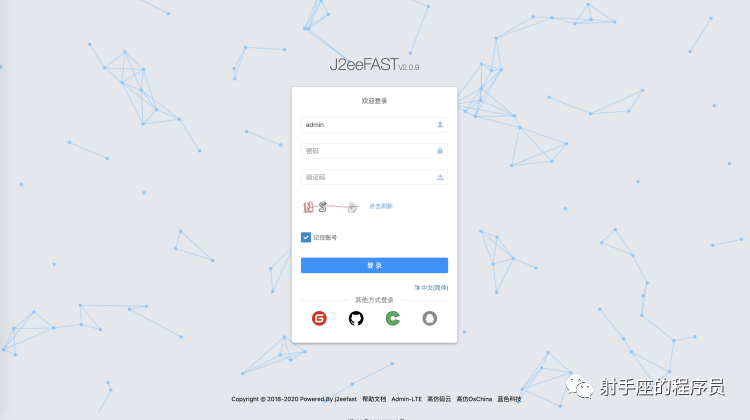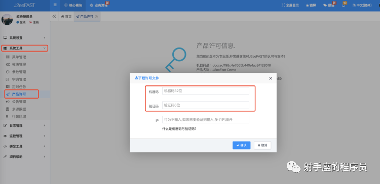 初次使用系统需要证书,项目启动会打出机器码,校验码等信息,请登录 http://demo.j2eefast.com 演示网站 账号 admin 密码 admin