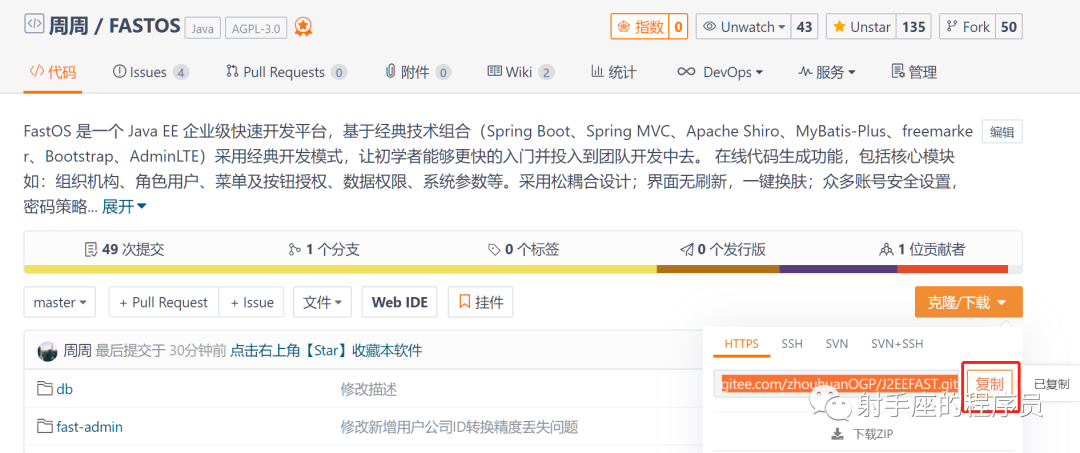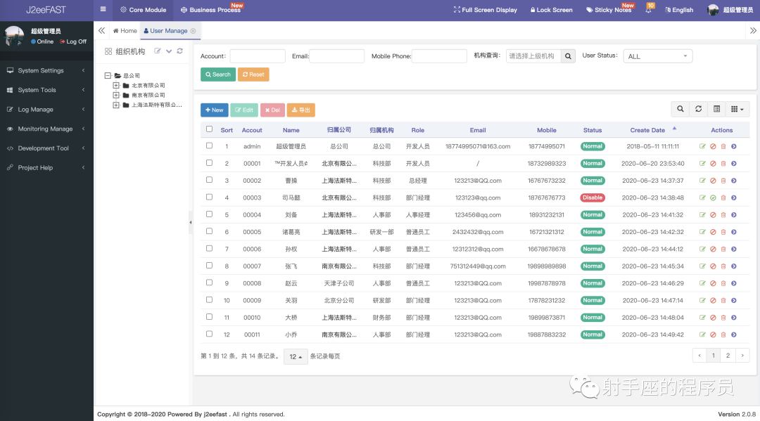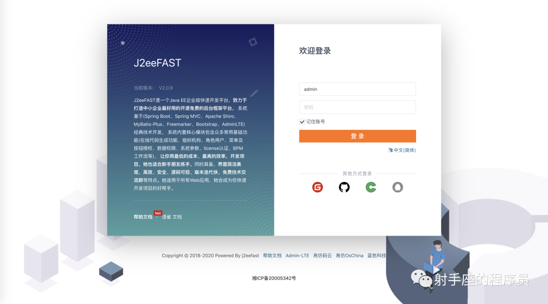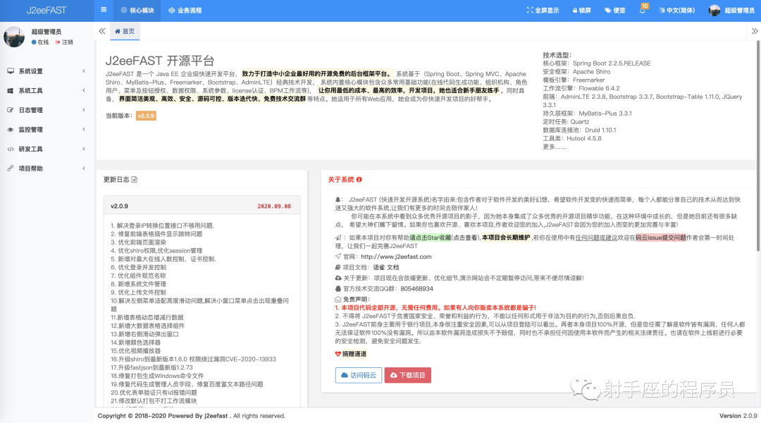 J2eeFAST 是一个 Java EE 企业级快速开发平台, 致力于打造中小企业最好用的开源免费的后台框架平台 。系统基于(Spring Boot、Spring MVC、Apache Shiro、MyBatis-Plus、Freemarker、Bootstrap、AdminLTE)经典技术开发, 系统内置核心模块包含众多常用基础功能(在线代码生成功能、组织机构、角色用户、菜单及按钮授权、数据权限、系统参数、license认证、BPM工作流等), 让你用最低的成本、最高的效率,开发项目,她也适合新手朋友练手 。同时具备, 界面简洁美观、高效、安全、源码可控、版本迭代快、免费技术交流群 等特点。她适用于所有Web应用,她会成为你快速开发项目的好帮手。
