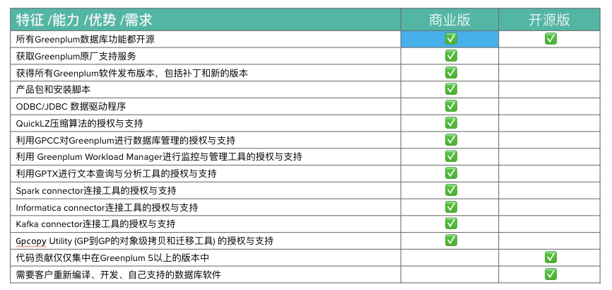 Greenplum开源版与商业版的核心数据库本身是没有任何区别的,其自带的功能都已开源。但商业版能更好的帮助用户把Greenplum用好,发挥其价值,众多商业版组件功能的加持将让这款产品如虎添翼。下图中详细展现了Greenplum商业版与开源版的区别。此外,用户在使用Greenplum后,面对大数据的处理,往往希望能保证系统的安全性、可靠性、和稳定性。而原厂的服务将帮助用户更加安全的使用Greenplum,充分利用其强大的功能,发挥其优势。Greenplum商业版项目实施服务的服务模式大概分为三种:- 标准维保服务提供7*24小时热线技术支持,为系统运维提供可靠保障