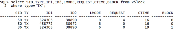 此时有2个TX锁,SID=36的会话阻塞SID=50的会话。36持有的锁模式为6,而50请求的锁模式为4,同时它持有另一个模式为6的TX锁资源。