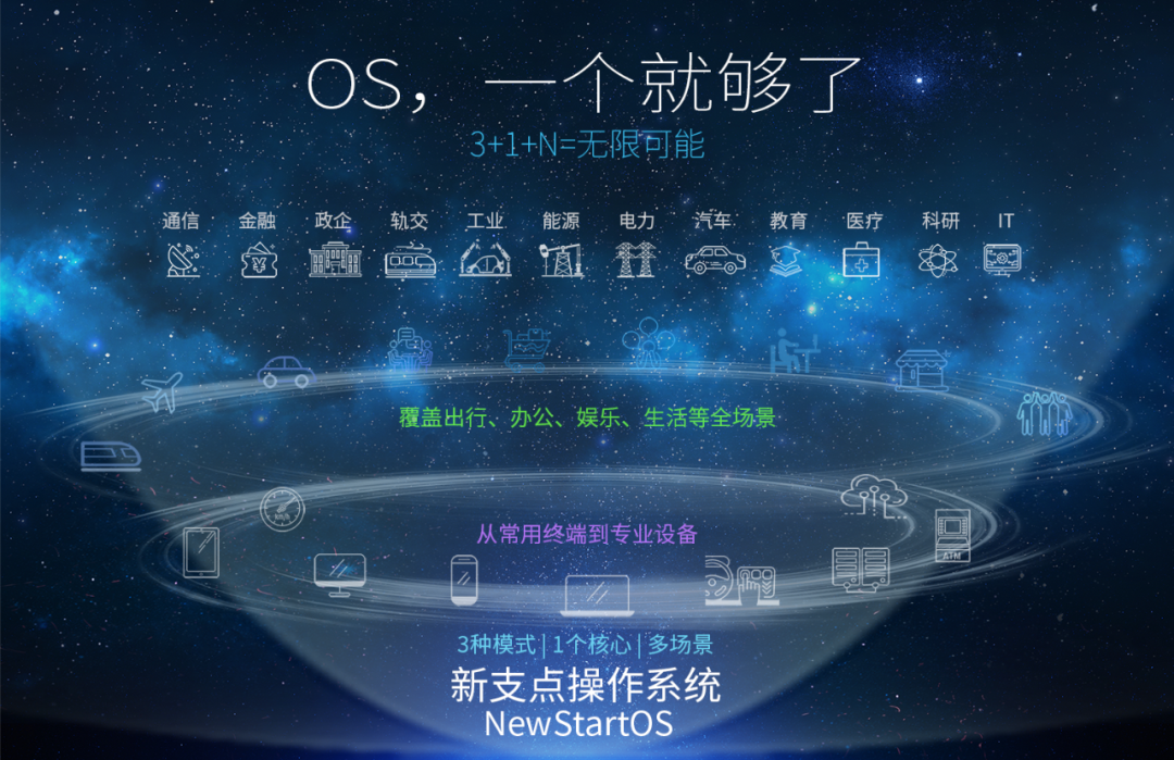 3种模式(桌面模式、服务器模式、平板模式)、1个核心(微内核)、N种场景,只需一个操作系统即可满足各种设备的需求,从常用的笔记本电脑、一体机、台式机、平板电脑,到专用的智能终端、智能汽车、服务器、边缘计算、云计算平台、数字基础设施等,让不同场景不同设备使用同一平台,解决操作系统的碎片化。