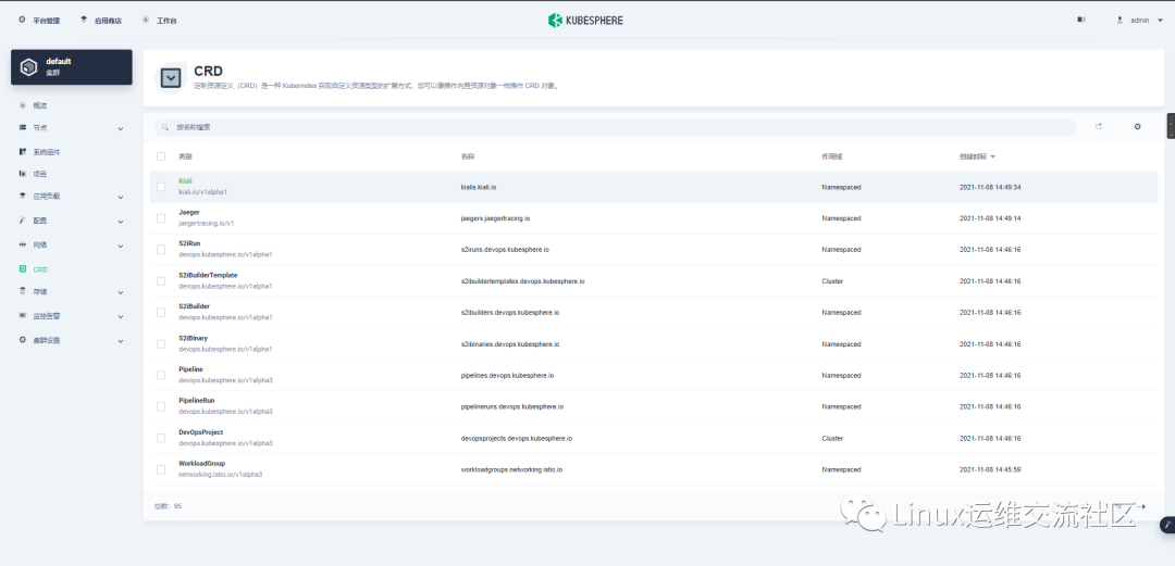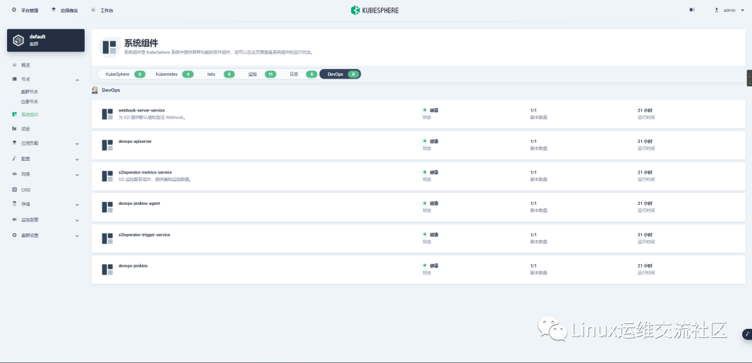登录 KubeSphere 控制台,在系统组件中可以查看不同组件的状态。