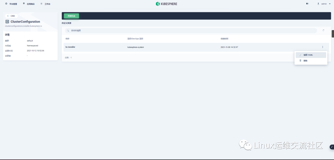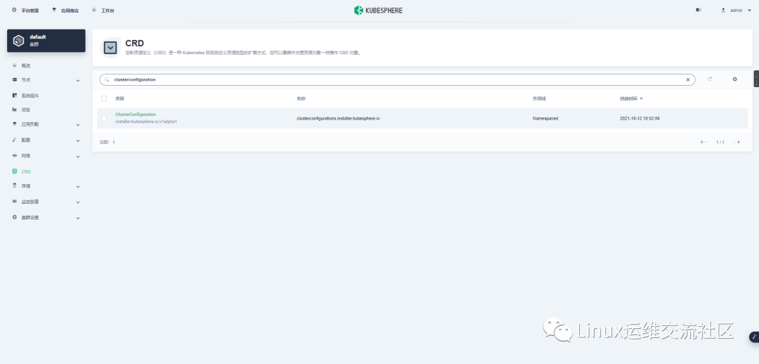 点击 CRD,然后在搜索栏中输入 clusterconfiguration,点击搜索结果进入其详情页面。