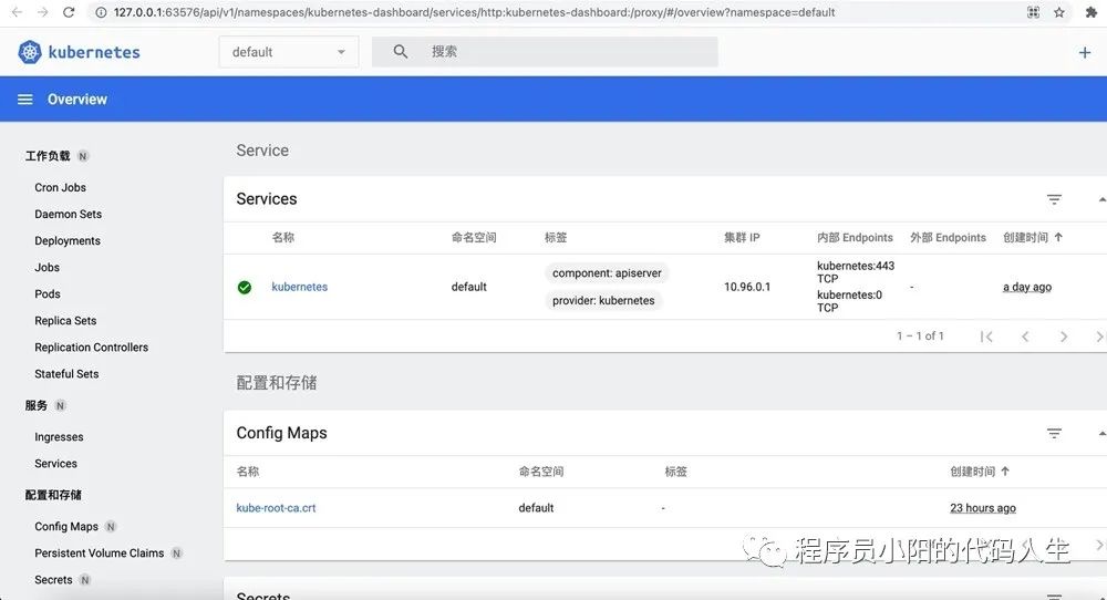 ~ minikube dashboard #打开Dashboard 会自动打开访问链接(端口随机),http://127.0.0.1:63576/api/v1/namespaces/kubernetes-dashboard/services/http:kubernetes-dashboard:/proxy/#/overview?namespace=default