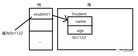 这种方式就是实例化一个对象,将会在堆空间给这个对象分配内存地址,在栈空间划分一个地址给student1,student1的值为堆空间的对象的地址,对象的name和age属性都会有初始值。如图所示,堆空间给对象分配的起始地址为0x1122,栈空间student1引用0x1122的地址空间。
