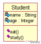 这个图是用Rose画的,关于属性和方法的修饰符的表示后面会介绍,这里的name和age属性都是private修饰的,前面带一把锁,eat()和study()方法是用public修饰的。