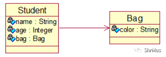 类之间最常用的关系,用来表示一个类的对象和另一个类的对象有联系,使用编程语言实现关联关系时,将一个类的对象作为另一个类的成员变量,使用类图表示关系时,使用一个带箭头的实线。例如,一个学生有一个书包。如图所示。
