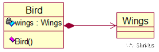 这种关系也表示整体和部分的关系,但是成员对象不能脱离整体对象单独存在,若整体对象不存在,成员对象也不能存在。例如,鸟和翅膀的关系,如图所示。