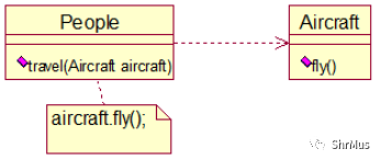 依赖关系是一种使用关系,被使用的类的对象发生改变可能会影响到使用的类的对象,主要体现在某个类的方法使用另一个类的对象作为参数。在UML图中用带箭头的虚线表示。例如,人们选择坐飞机去旅游。如图所示。
