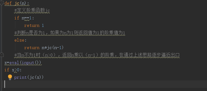 首先我们来分析n!,n!=n!=1×2×3×...×n。同时n!还可以表示为n!=(n-1)!×n。通过第二个表达式我们不难看出我们将n!问题转化为求(n-1)!。那么我们再将(n-1)!用这个方法逐步展开最终我们要求的问题就是1!,然而我们知道1!=1。那么n!问题通过不断的转化就得到了解决,而1!就是我们所说的出口。下面我们来看代码的解析。