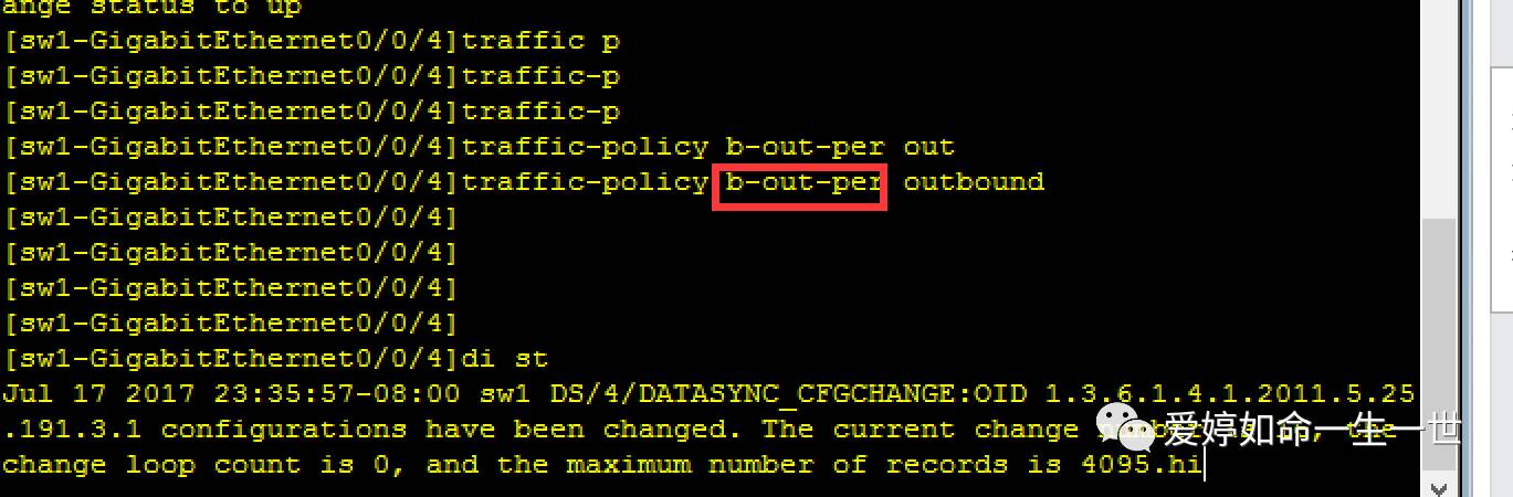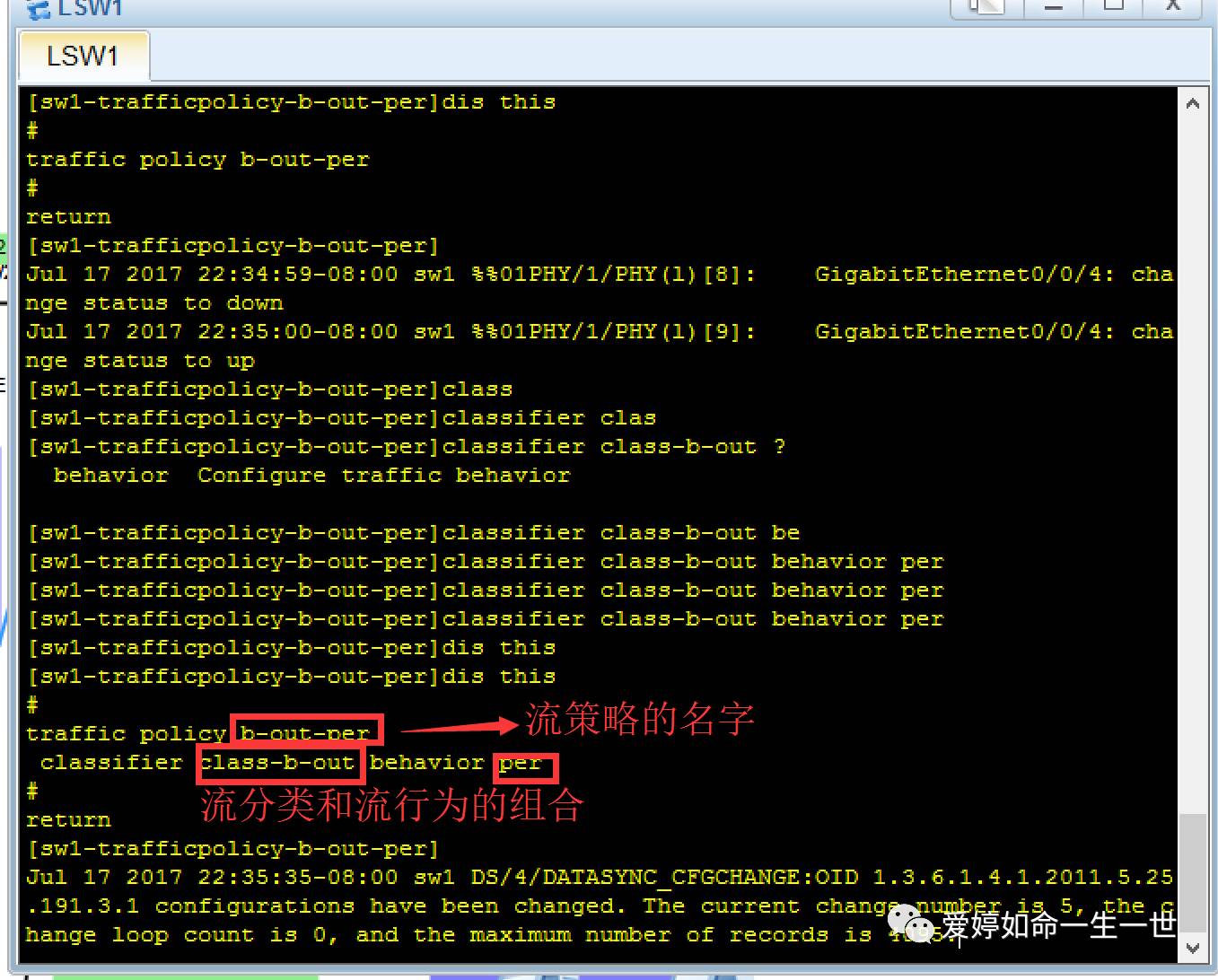 这个配置定义目的就是把之前两步流分类+流行为关联在一起,这里我取名为了简化取class-b-out-per/dent,取带颜色的字段:然后我将流分类和流行为关联在一起,最后才能称之为流策略: