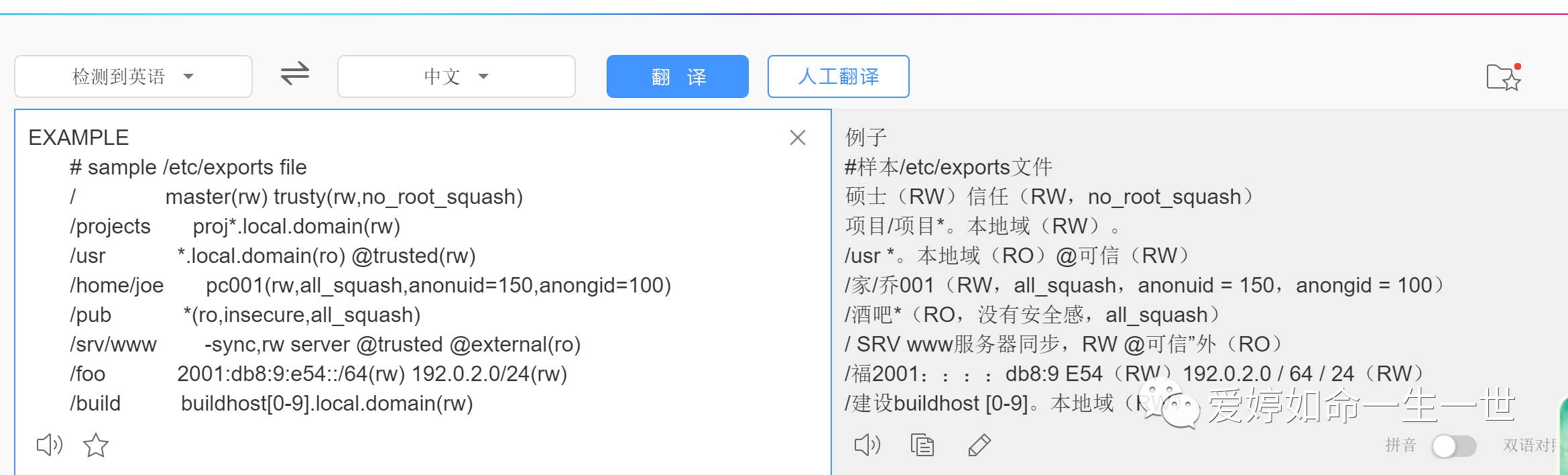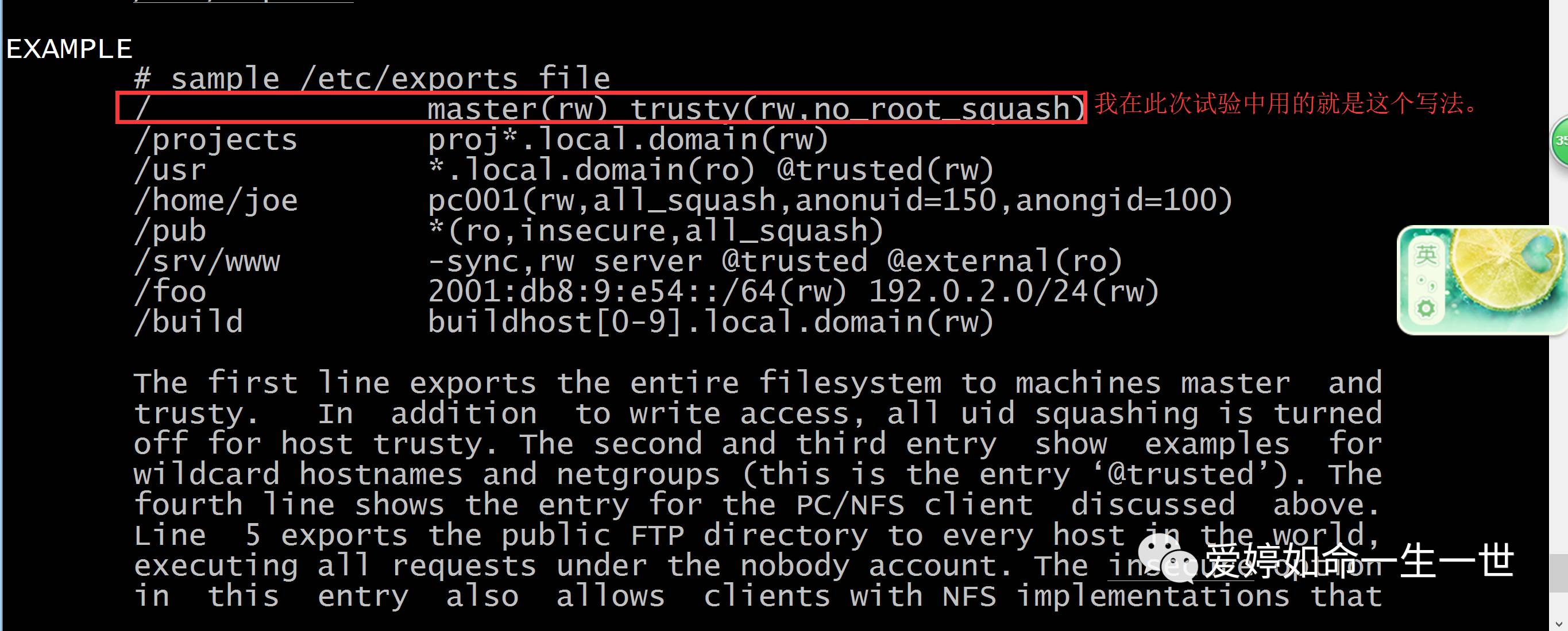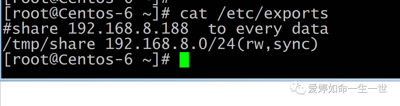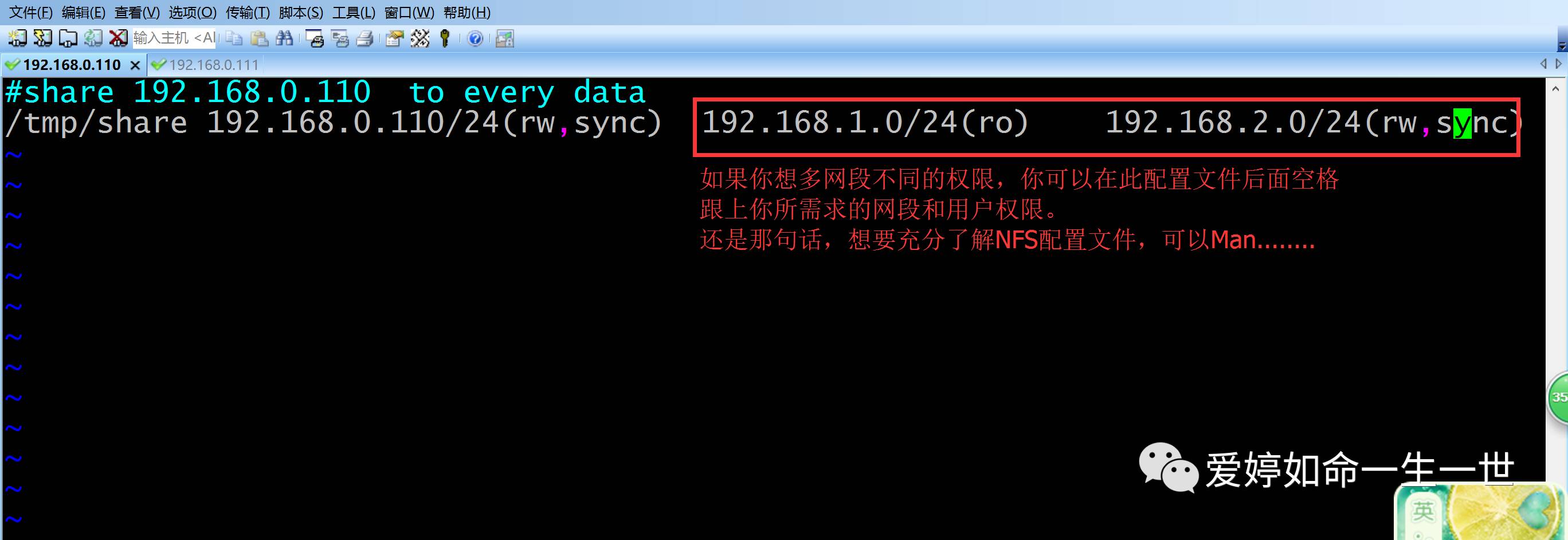 如果都通过后,这个/etc/exports文件也是我们用来管理NFS共享目录的使用权限与安全设置的地方,特别强调:NFS本身设置的是网络共享权限,整个共享目录的权限还和目录自身的系统权限有关。