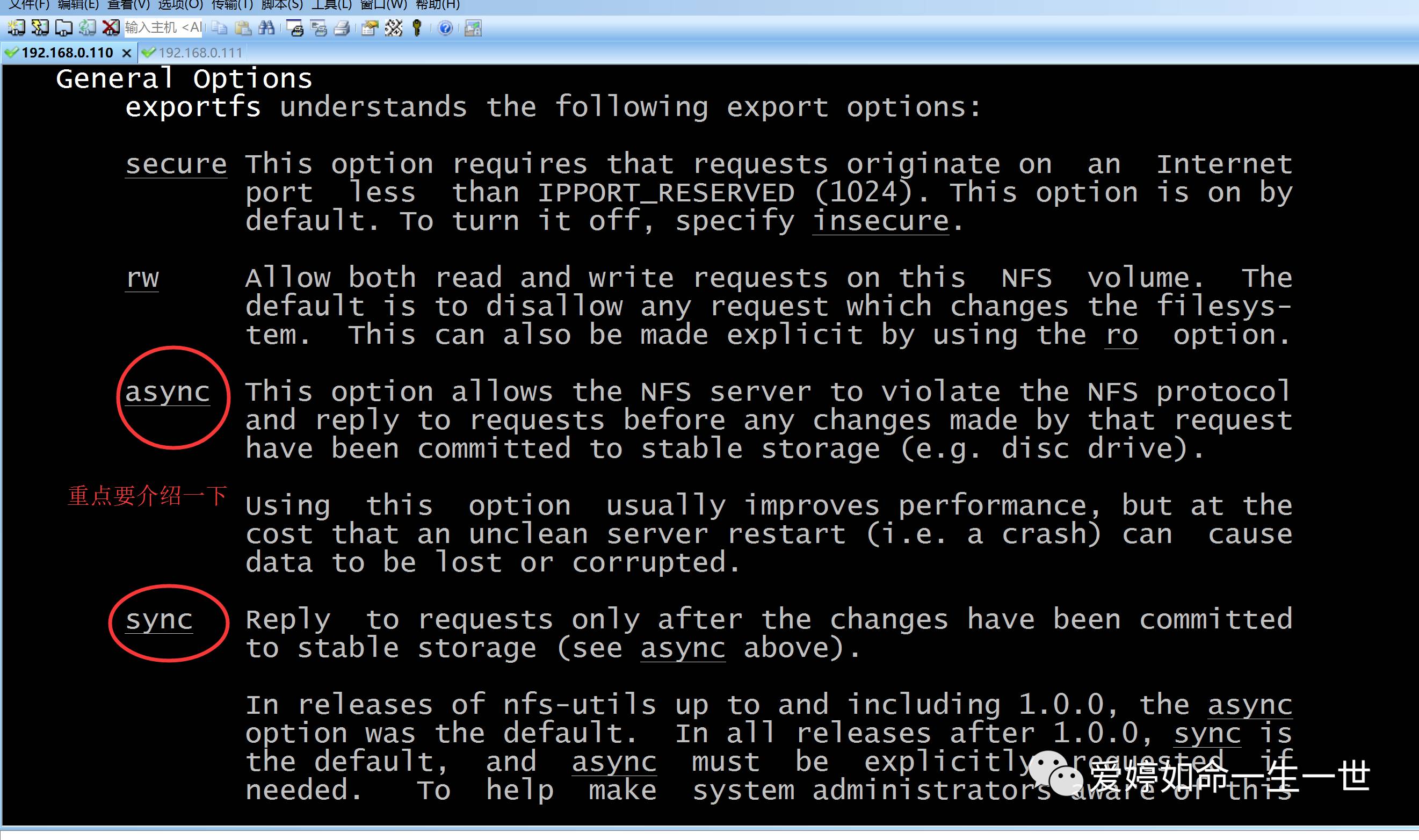 我在NFS配置文件中输入的一些配置是非常的简单的,但是NFS在默认时是帮我们写了很多进去的,例如: