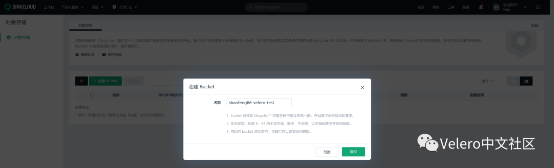 Velero 支持对持久卷以建立快照的方式备份,也支持使用restic将持久卷里的文件备份到对象存储,本文的实验中使用restic来备份到QingStor。