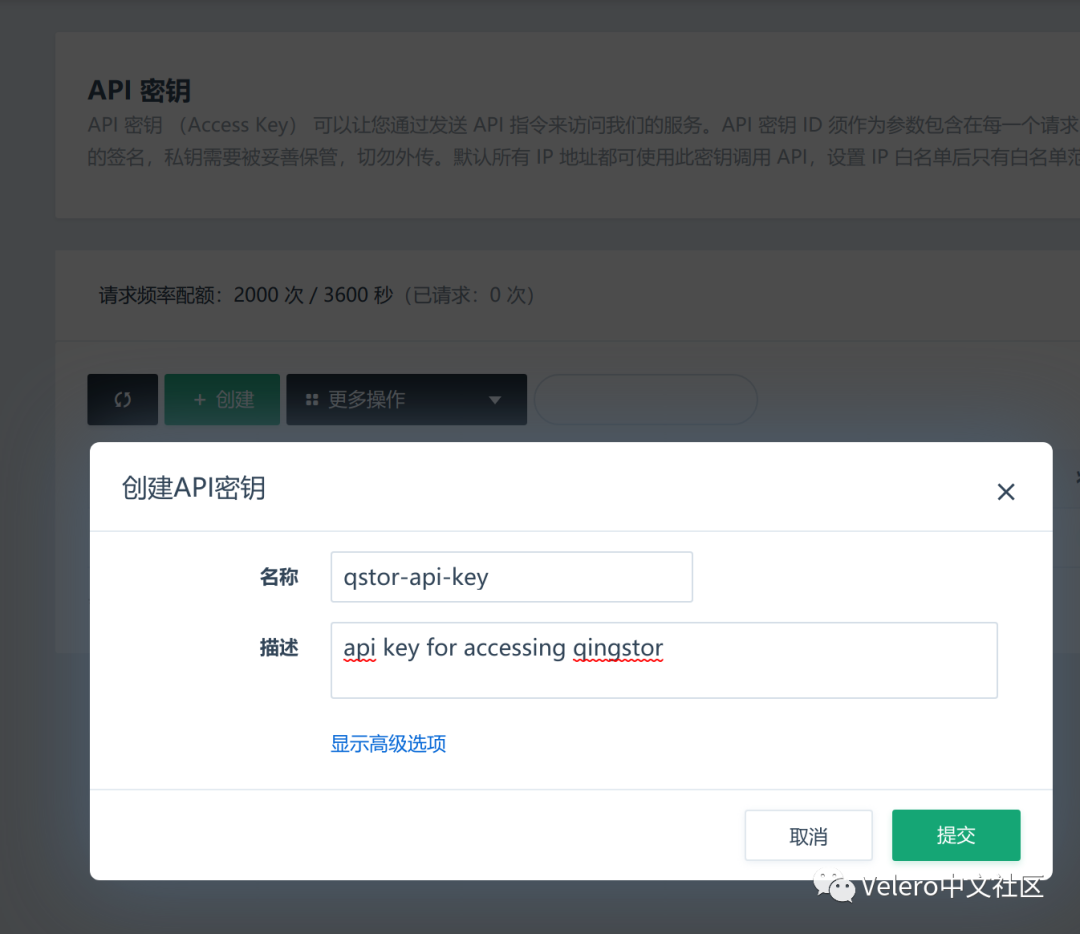 替换<access key id>和<secret access key>为之前步骤中得到的对应access key id 和 secret access key。(注:因为 QingStor 是AWS S3兼容对象存储,所以我们将使用 AWS 的 velero 存储后端插件)
