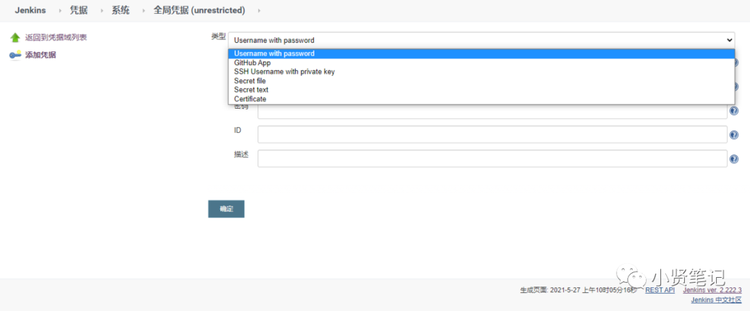 位置: Jenkins > 凭据 > 系统 > 全局凭据 (unrestricted) > 添加凭据