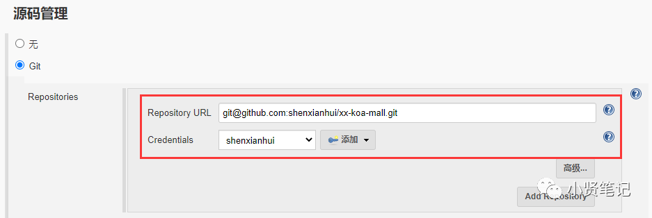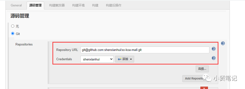 源码管理 把前面配置的凭据和对应的URL添加进去即可