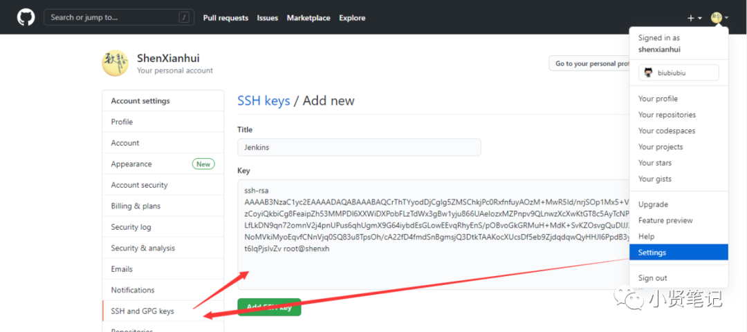 使用 root 用户生成公钥和私钥: ssh-keygen私钥文件: vim /root/.ssh/id_rsa公钥文件: vim /root/.ssh/id_rsa.pub把公钥内容拷贝到 GitHub 中:Settings - SSH and GPG keys - New SSH key