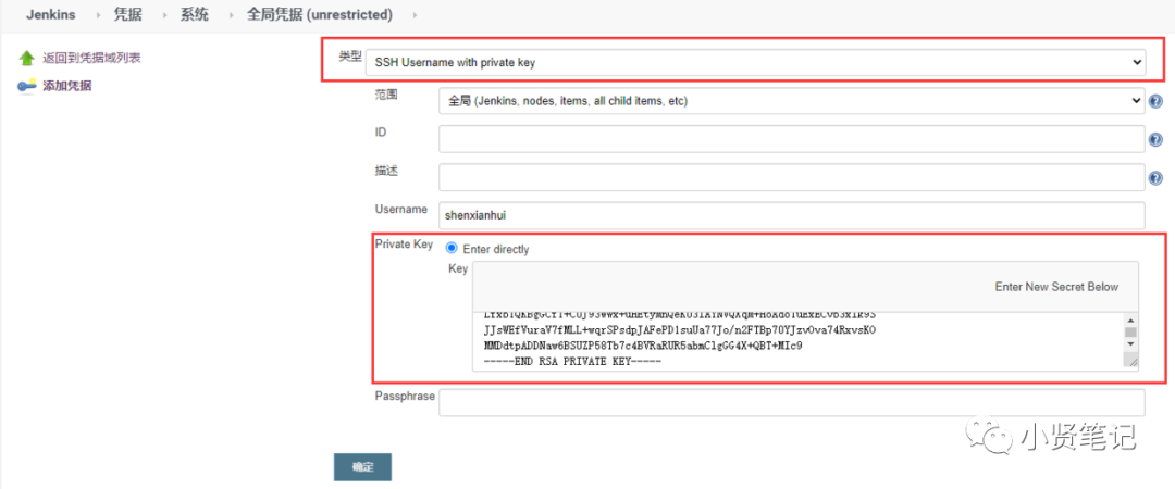 在 Jenkins 添加一个新的凭证,类型为 “SSH Username with private key”,把私钥文件内容复制过来