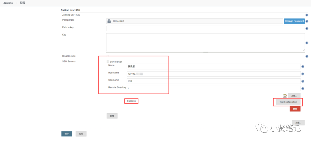 插件: Publish Over SSH 填写服务器信息, 点击"Test Configuration"后出现"Success"即为成功