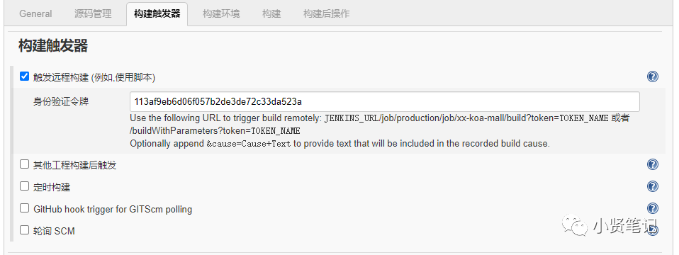复制生成的 Token 进入"工程配置", 找到"构建触发器", 勾选"触发远程构建 (例如,使用脚本)", 将 Token 粘贴至输入框