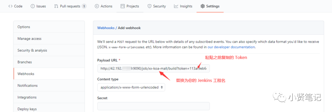 进入你的 GitHub 项目, Settings > Webhooks > Add webhook