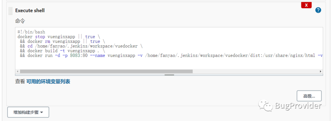 注意: 其中的 /home/fanyao/.jenkins/workspace/vuedocker 为jenkins的workspace路径。需根据自己安装的jenkins来修改为自己电脑的jenkins的工作路径。