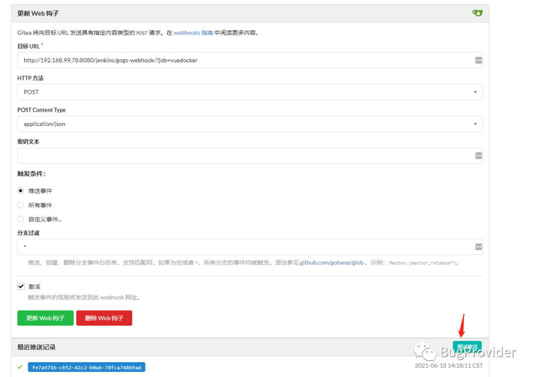 设置钩子成功后,点击测试推送,看到测试成功: