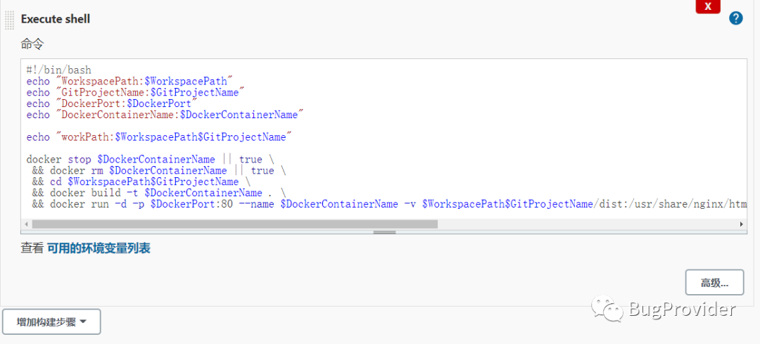 && docker run -d -p $DockerPort:80 --name $DockerContainerName -v $WorkspacePath$GitProjectName/dist:/usr/share/nginx/html -v $WorkspacePath$GitProjectName/nginx.conf:/etc/nginx/nginx.conf $DockerContainerName