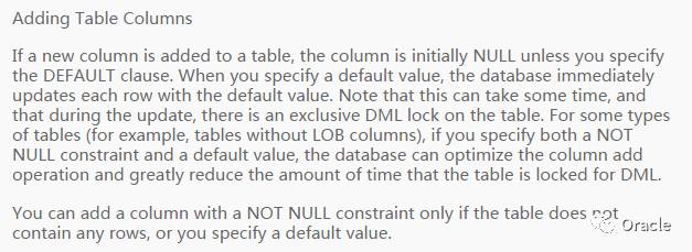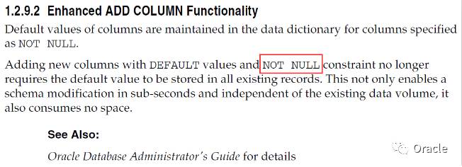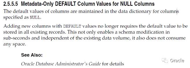 我们再看下官方文档的描述,11g中对于新增默认值字段的描述部分,明确指出NOT NULL约束包含默认值的情况下,是将默认值存储于数据字典中。